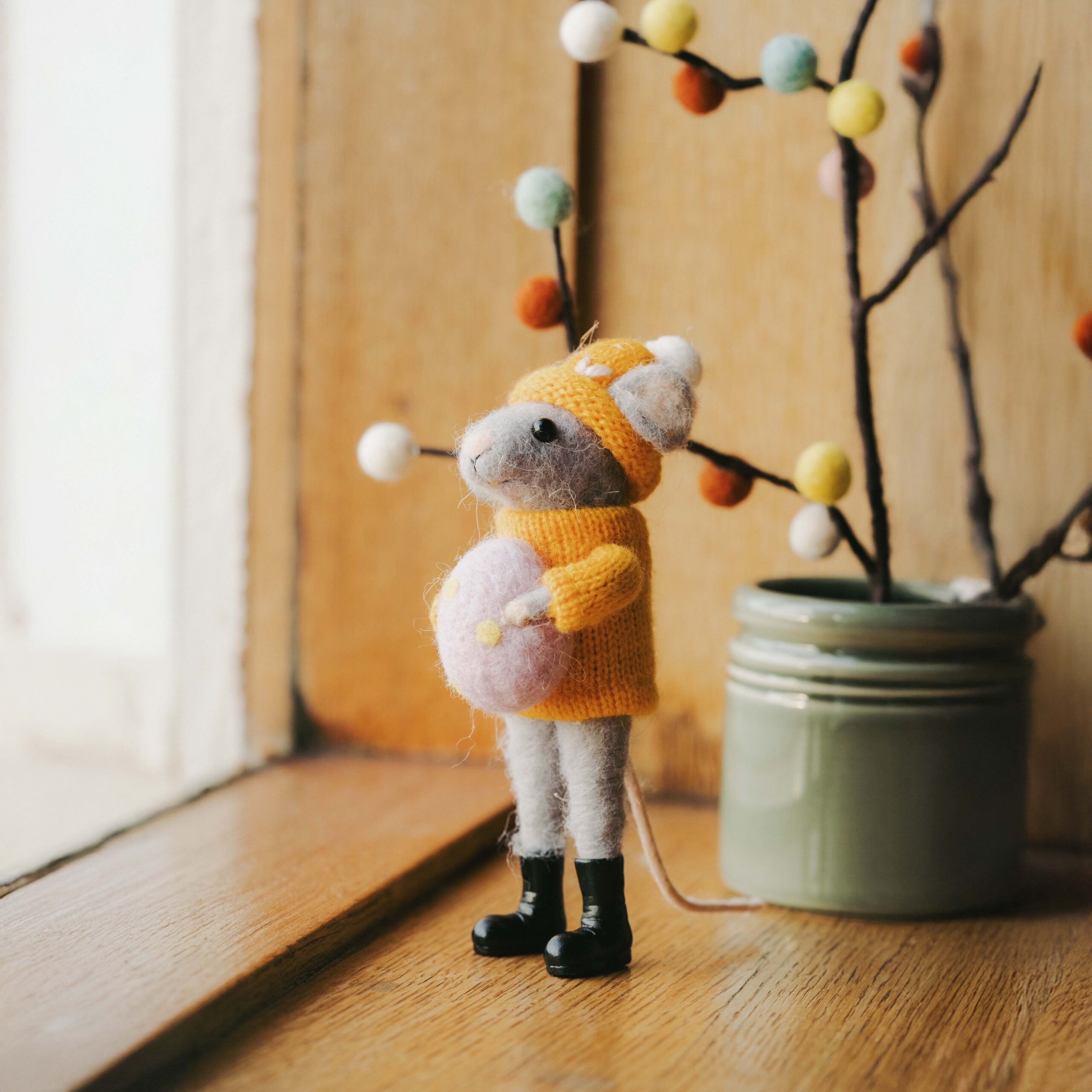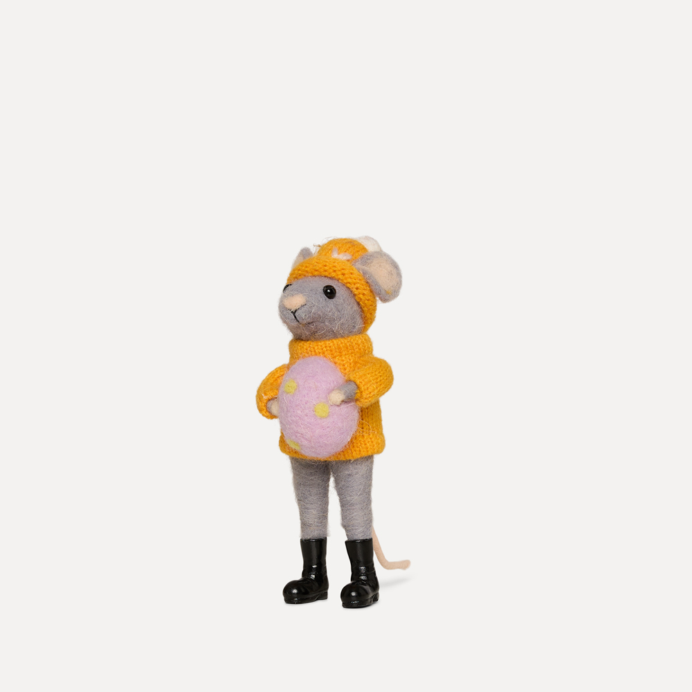 Dekorativ figur av en liten mus kledd for tur. Espen vandremus har på seg en gul genser og lue, støvler på beina og holder et påskeegg i hendene.