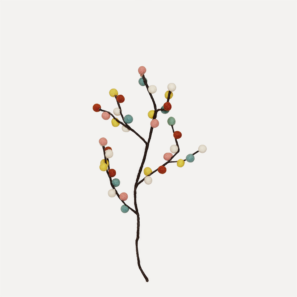 En dekorativ kvist med små fargerike bær i ull som gir et hint av vår og påskestemning i interiøret. Kvisten passer fint i en vase alene, eller sammen med andre grener for et litt fyldigere uttrykk.