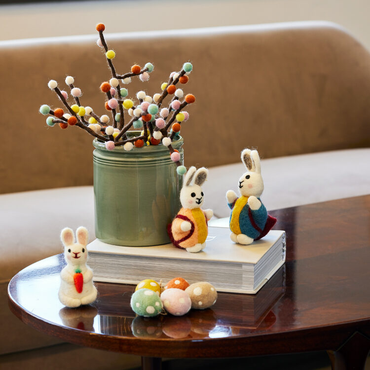 De myke ullkulene i ulike farger gir et lekent og håndlaget preg. Den enkle formen gjør at den fungerer både som påskepynt og som en liten vårdetalj i hjemmet ellers.
